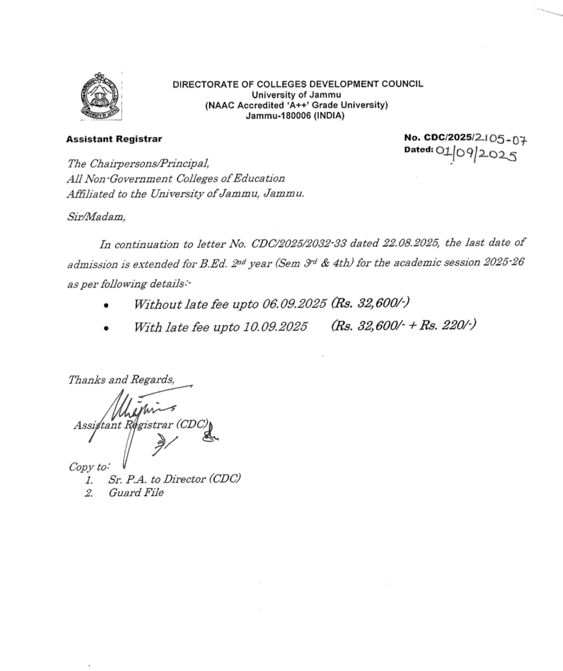 Last date of admission is extended for B.Ed 2nd year 2025-26