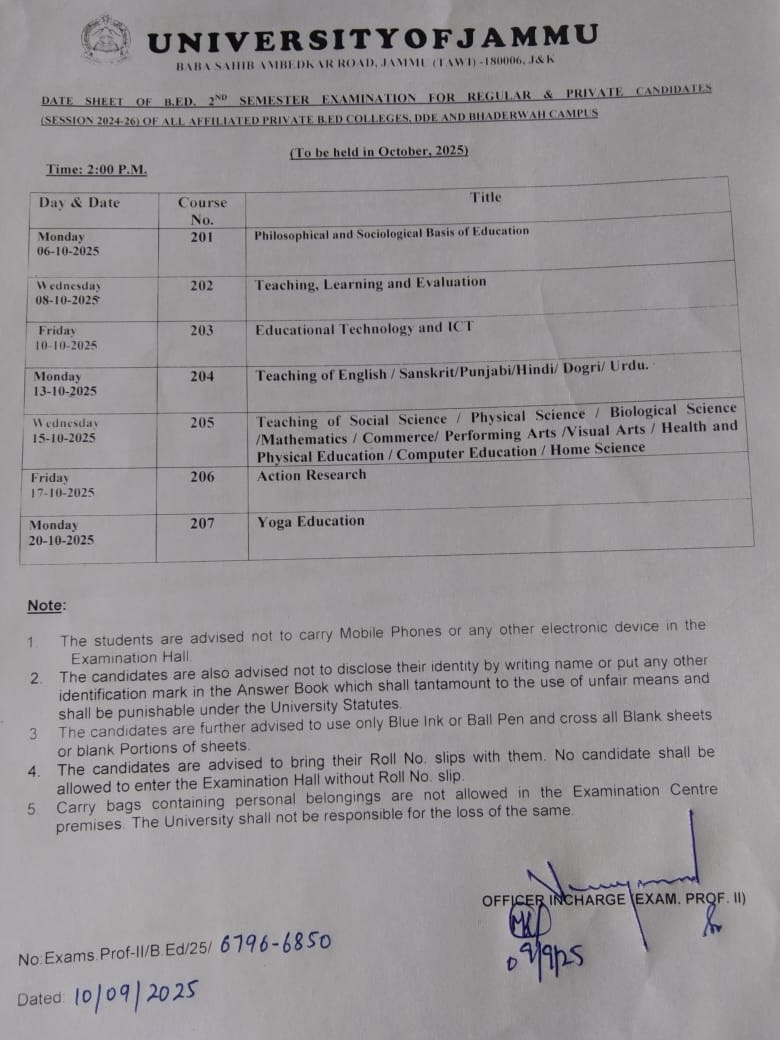 Date Sheet of Semester 2nd Session 2024-26